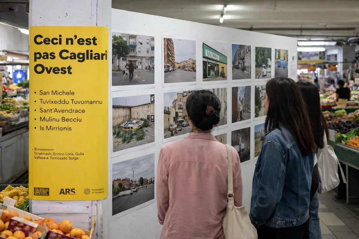 Stanno tra i banchi, lungo le pareti, dentro un luogo che continua a fare il suo mestiere di sempre, con la spesa del mattino, le chiacchiere, i passaggi veloci, le abitudini del quartiere. “Ceci n’est pas Cagliari Ovest” parte proprio da qui: dal rifiuto di trasformare la città in una vetrina pulita e vendibile, da consumare in pochi secondi sullo schermo di un telefono. Il progetto mette al centro ciò che di solito resta ai margini, cioè i dettagli ordinari, gli angoli meno celebrati, i pezzi di città che non cercano di piacere a tutti e proprio per questo finiscono per dire qualcosa di più vero.